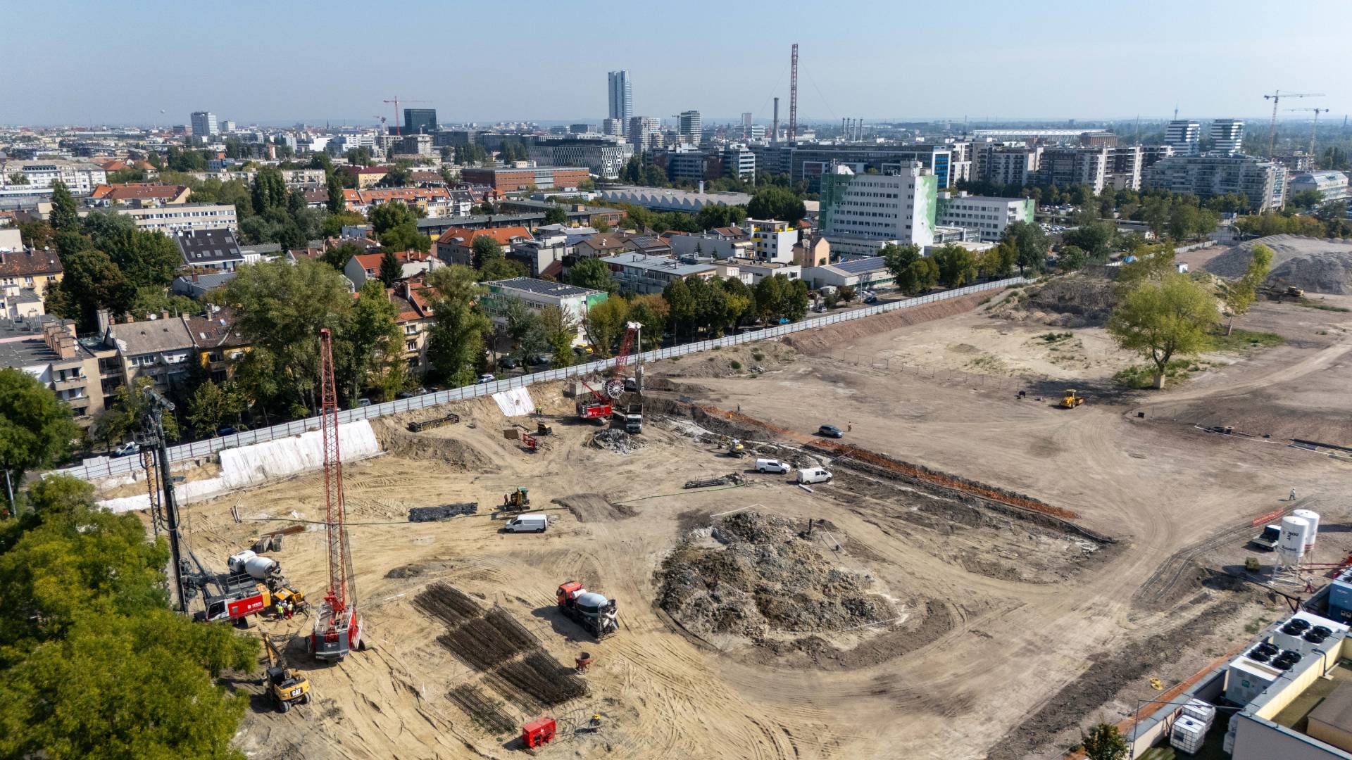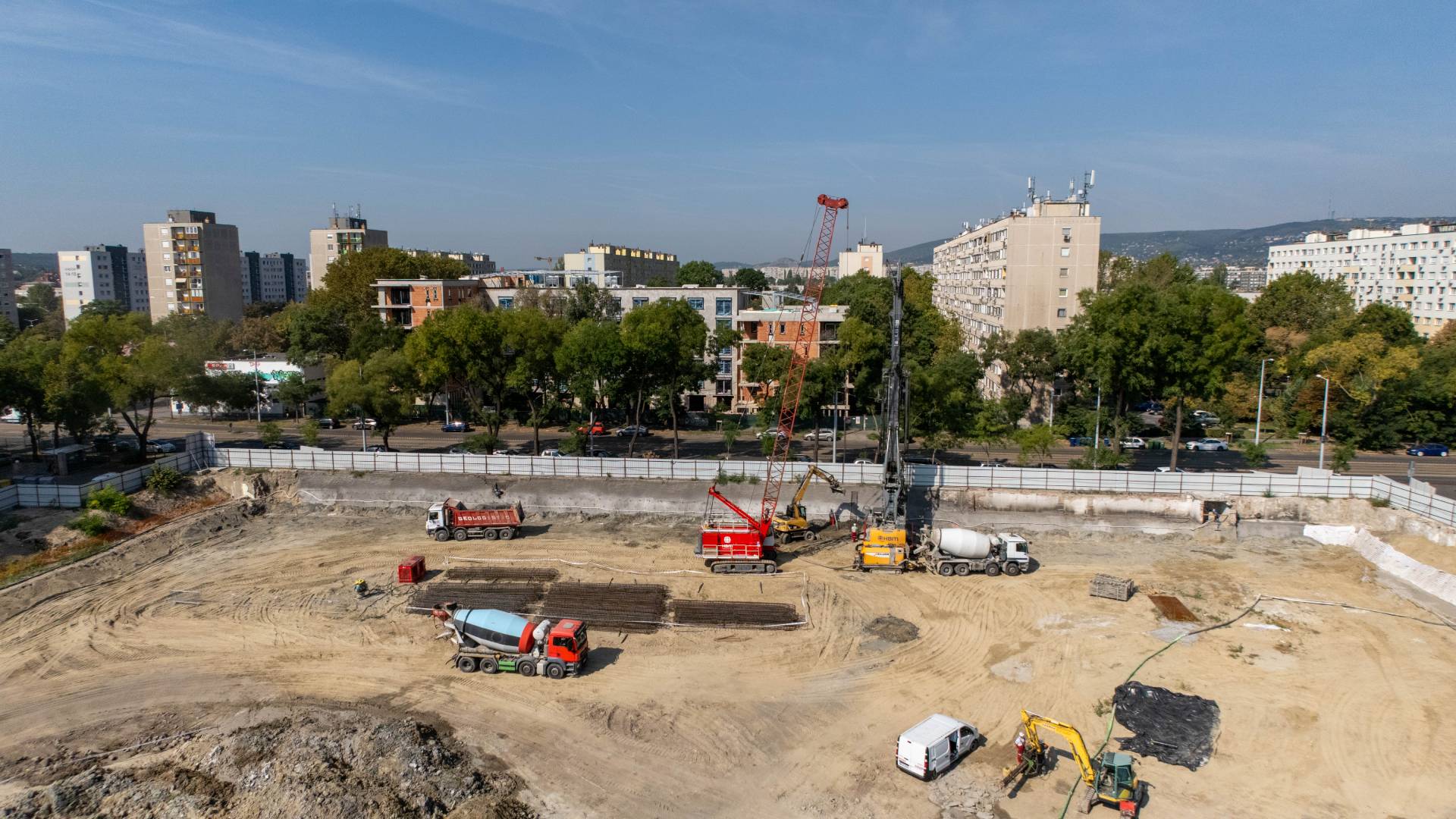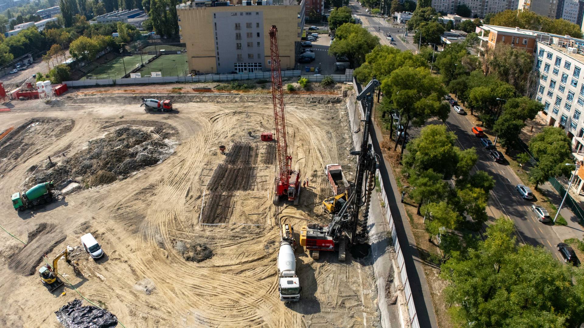Most a földmunka zajlik, és megtámasztjuk a munkagödröt, hogy a következő lépések biztonságban elindulhassanak. Szeptemberben kezdjük a cölöpözést: ez azt jelenti, hogy vasalt betonoszlopokat süllyesztünk a földbe, amelyek hosszú időre stabil alapot adnak az épületeknek.